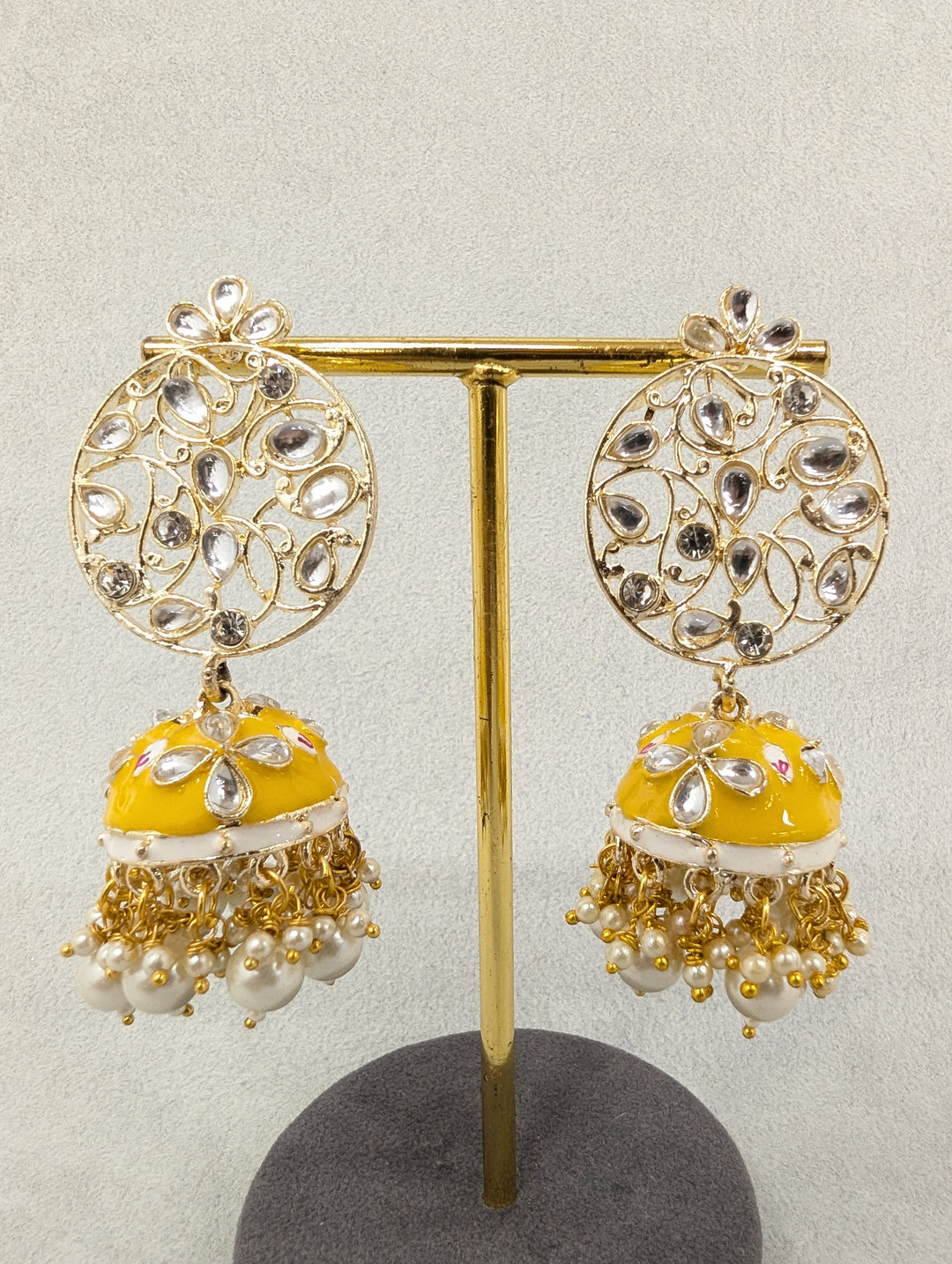 Meenakari earrings are intricate and colorful jewelry pieces crafted using the traditional Indian enameling technique known as Meenakari. They feature vibrant, hand-painted designs with motifs like flowers, peacocks, or geometric patterns, often adorned with gold or silver plating. Lightweight and elegant, they are perfect for weddings, festivals, or special occasion