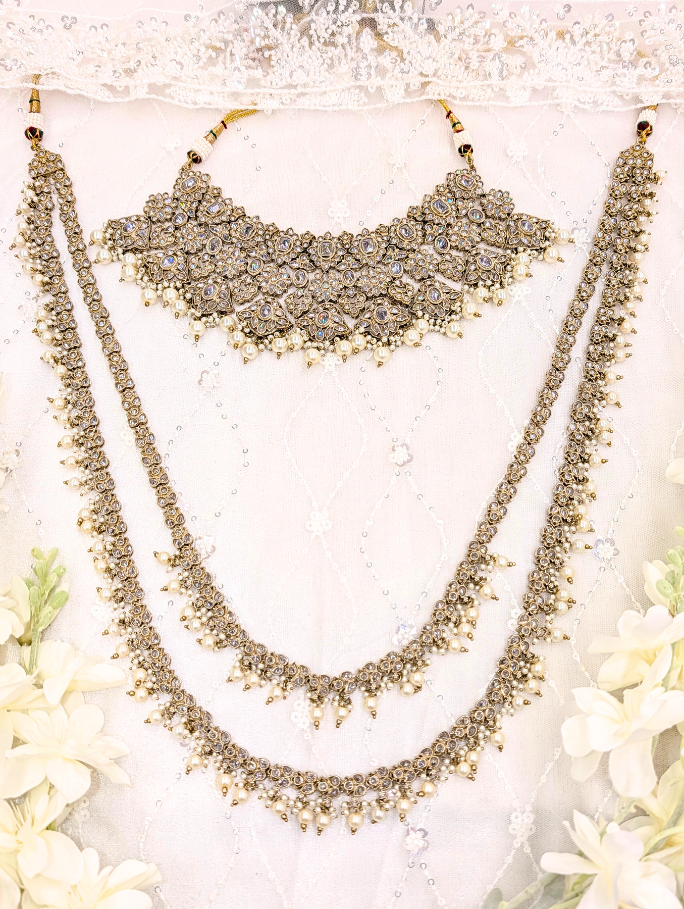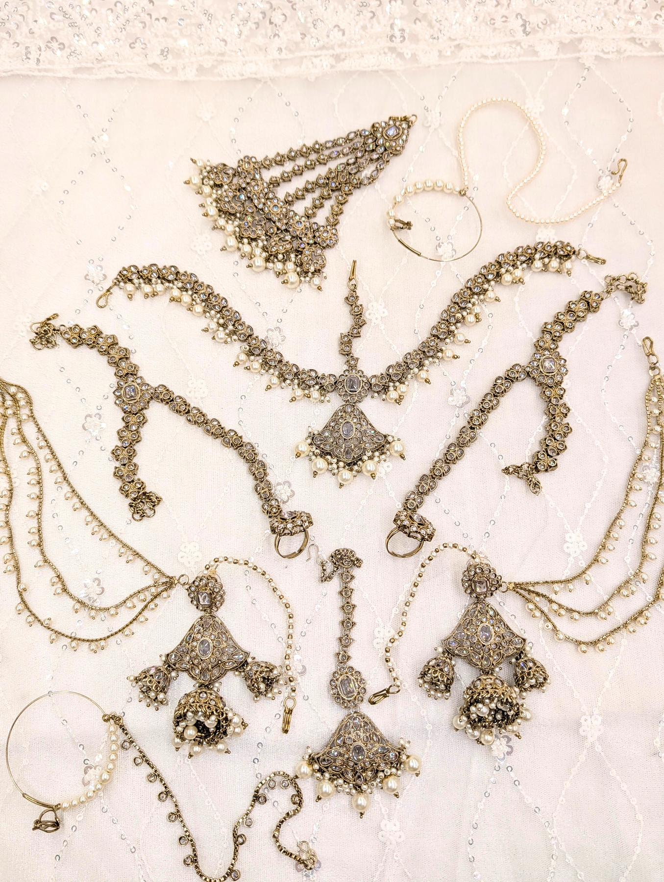 Includes: Necklace, Mala, Earring, Jummar, Hand Piece, Nose Ring and Maang Tikka