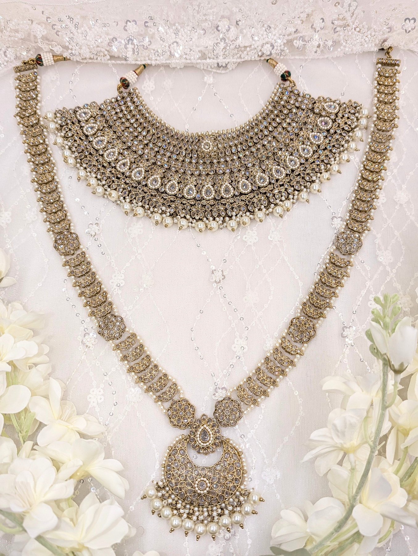 Includes: Necklace, Mala, Earring, Jummar, Hand Piece, Nose Ring and Maang Tikka