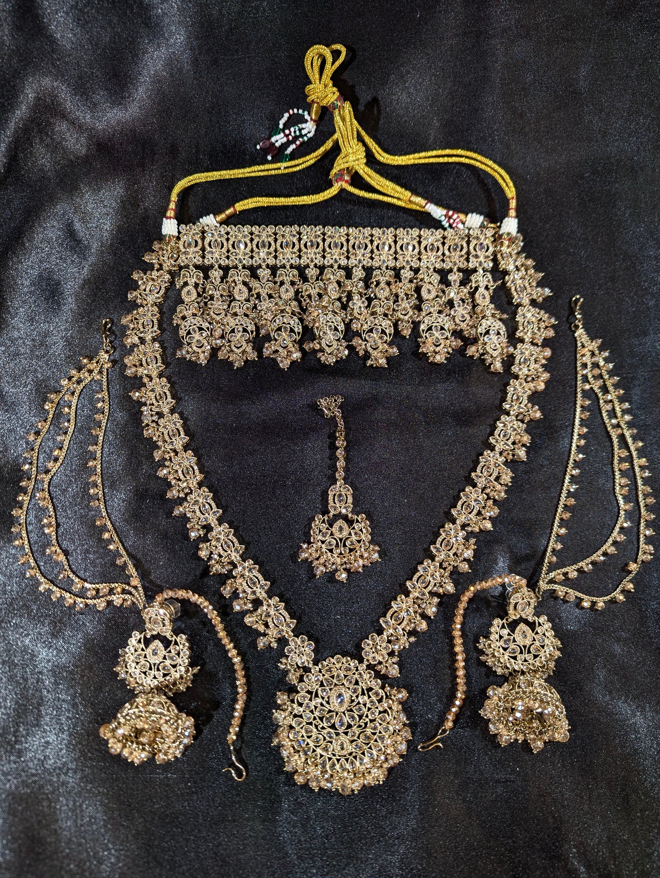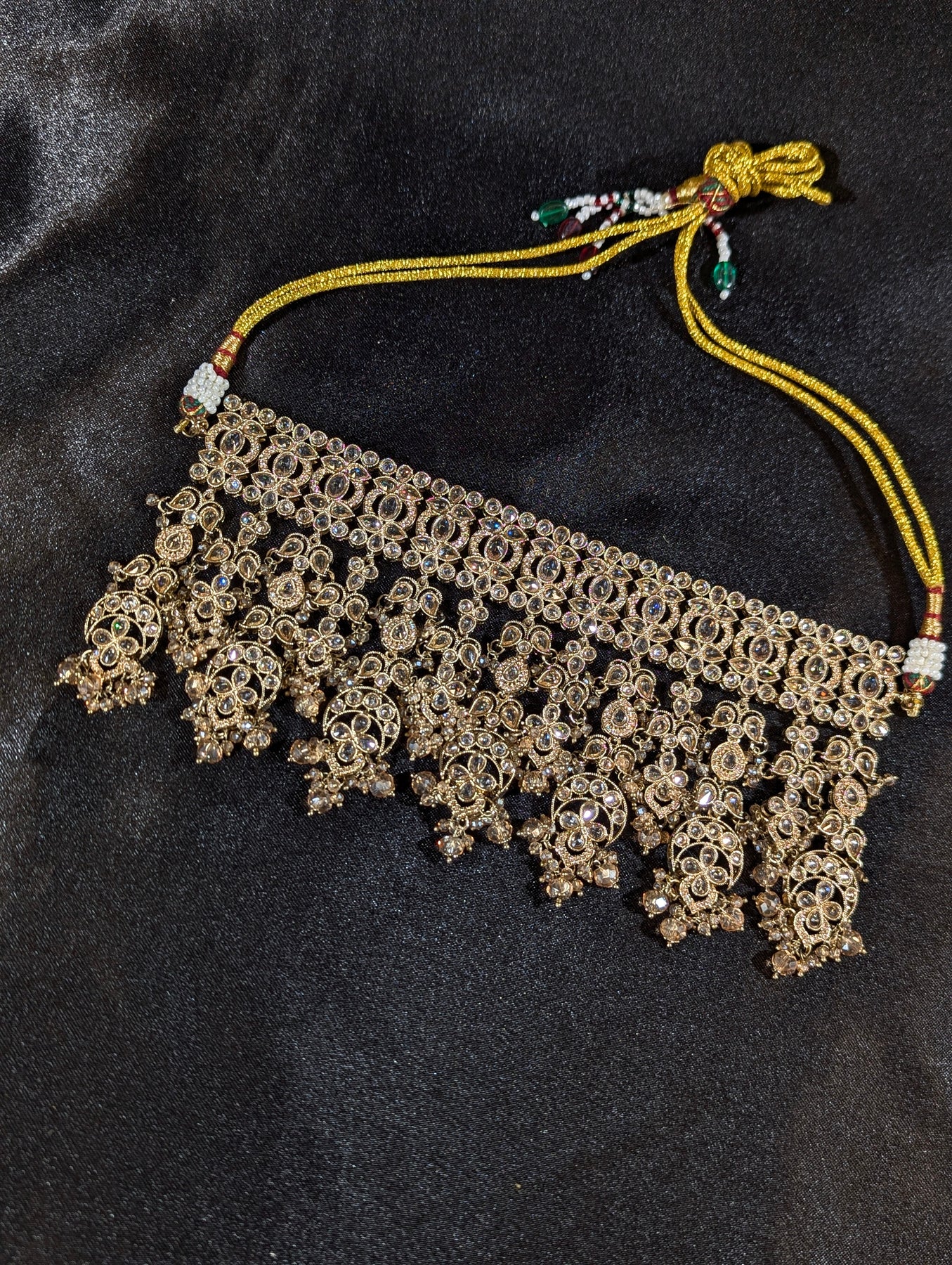 Necklace: The centerpiece of the set, often crafted in layers or with a broad choker style. Designs may include floral, paisley, or temple motifs and are encrusted with faux gemstones to create a luxurious effect.