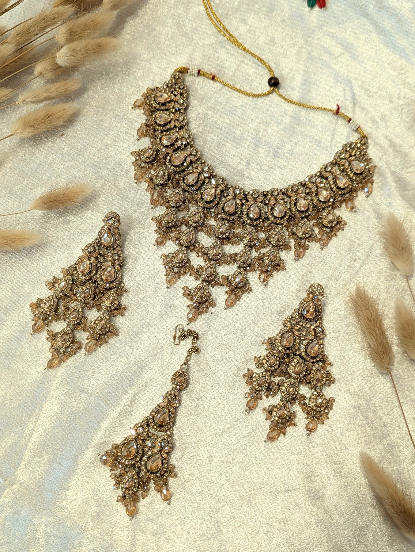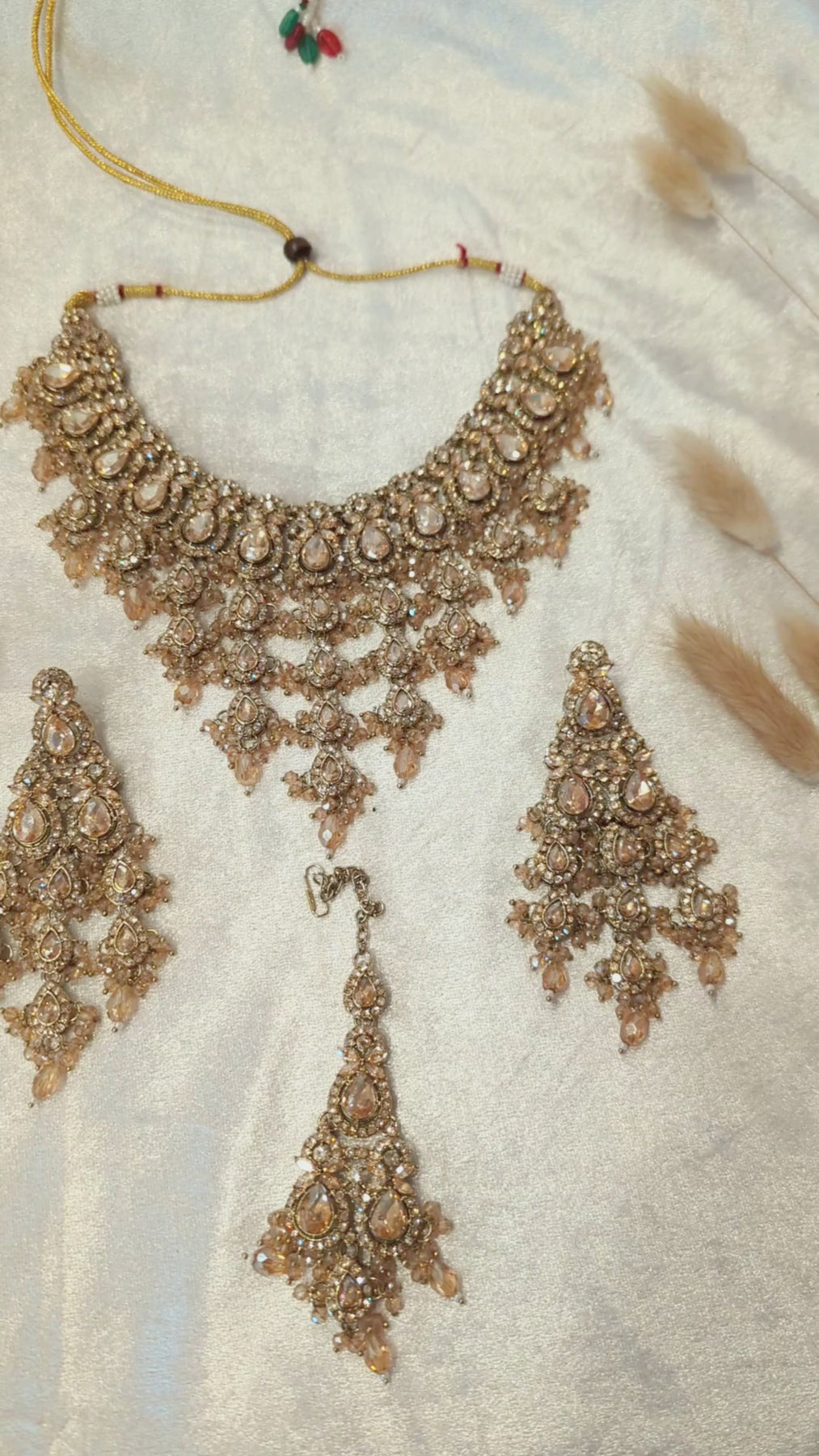 A Polki full set is a stunning traditional jewelry ensemble featuring uncut natural diamonds set in intricate gold or silver settings. Known for its royal charm and timeless appeal, this set typically includes a necklace, earrings, maang tikka, and sometimes bangles or a ring. Perfect for weddings and festive occasions, Polki sets exude regal elegance and beautifully complement bridal and ethnic attire.