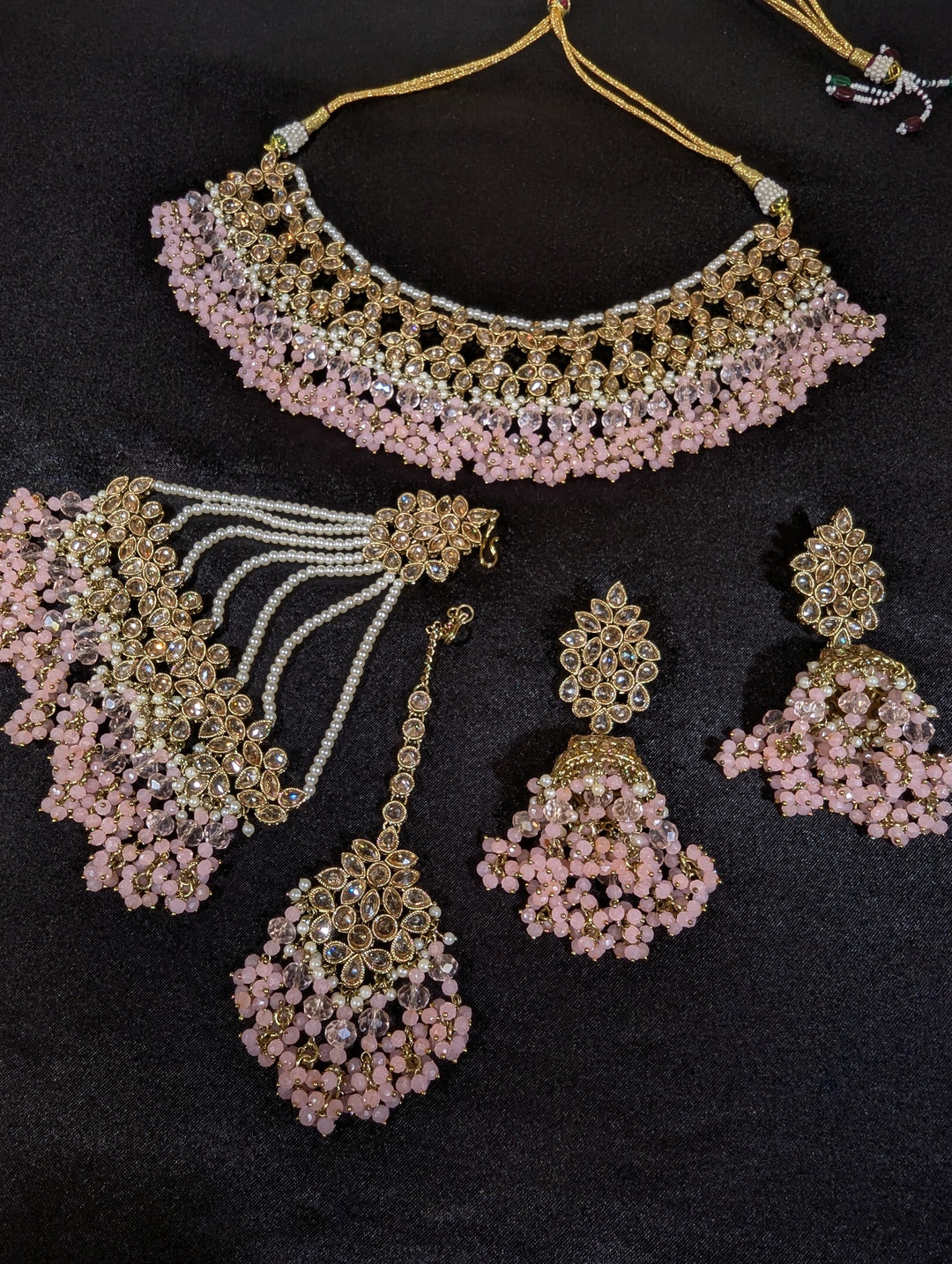 The semi-Indian bridal set typically includes a harmonious combination of statement necklaces, earrings, tikka, and jummar all carefully crafted with intricate detailing and luxurious materials. These pieces enhance the bride's beauty and complement her wedding attire, whether a saree, lehenga or any other traditional outfit.