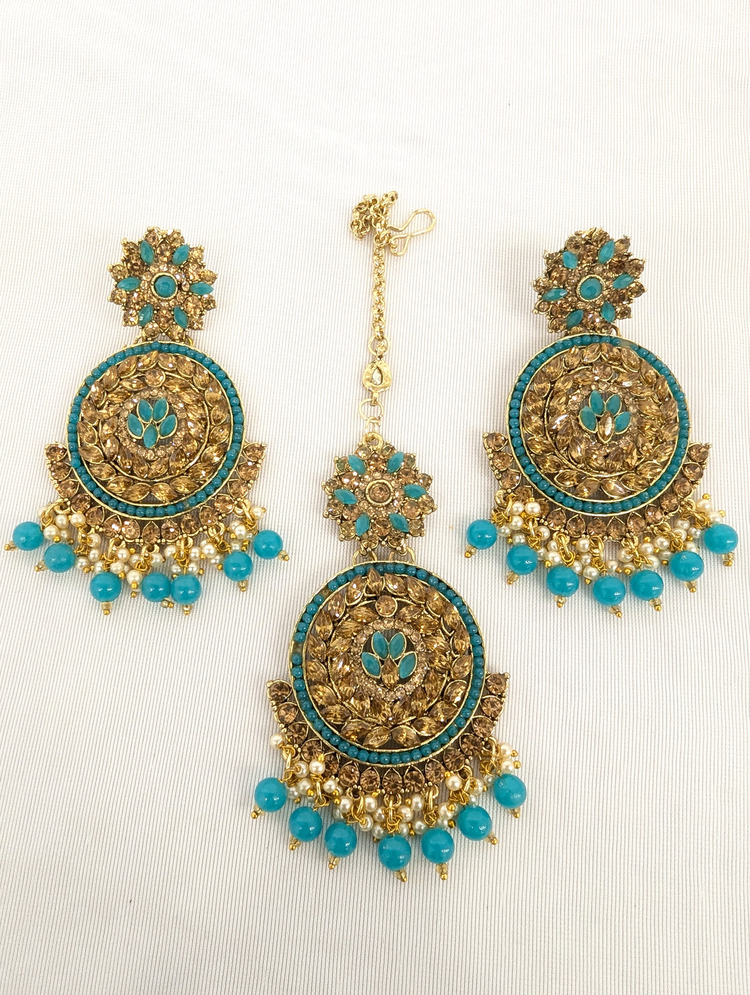 Elegant stone earrings and tikka set, featuring intricate designs with shimmering stones. Perfect for weddings, parties, and festive occasions. Adds a touch of sophistication to any look.