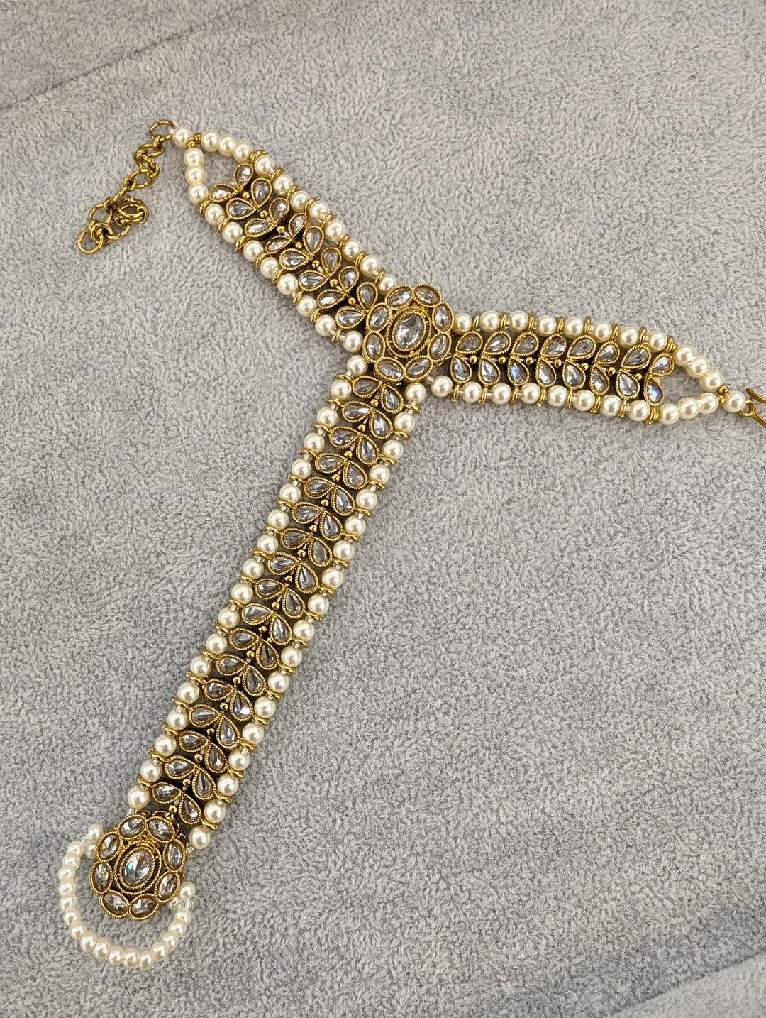 A hand harness is a beautiful and intricate piece of Indian jewelry that adorns the hand and wrist. It typically consists of a bracelet or cuff that is connected to a ring by a delicate chain, creating an elegant, connected look. The design often features traditional elements like gemstones, pearls, or intricate metalwork. Hand harnesses are popular in Indian bridal and festive wear, adding a touch of grace and sophistication to the hands while complementing other jewelry pieces. They symbolize beauty and are often worn during weddings and celebrations.