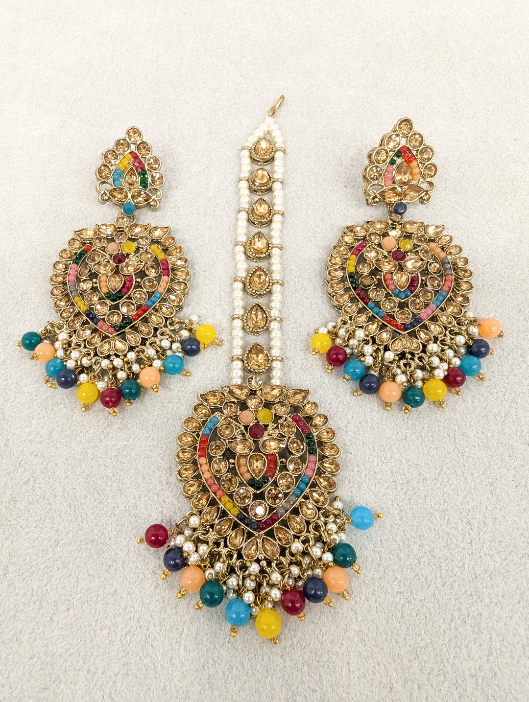 Elegant stone earrings and tikka set, featuring intricate designs with shimmering stones. Perfect for weddings, parties, and festive occasions. Adds a touch of sophistication to any look.