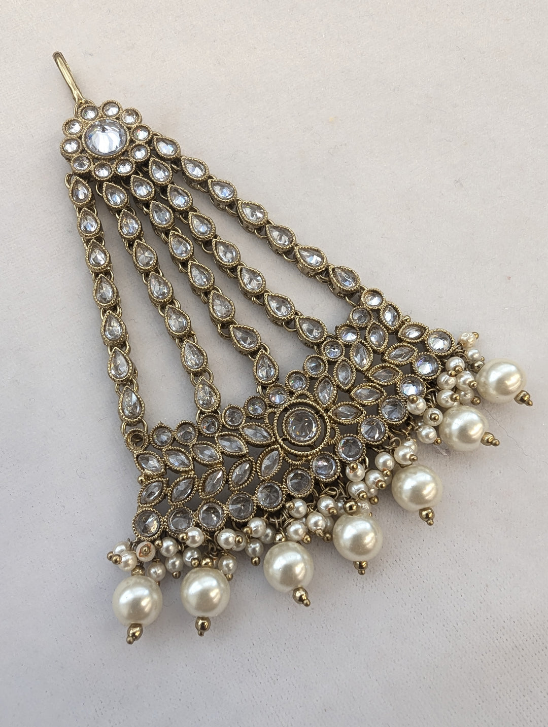 A Jummar is a traditional piece of Indian jewelry, typically worn as a decorative ornament in the hair or on the head. It often features intricate designs with beads, gemstones, or metalwork, and is commonly seen in weddings or festive occasions. The Jummar is a symbol of cultural heritage and elegance, popular in various Indian regions.